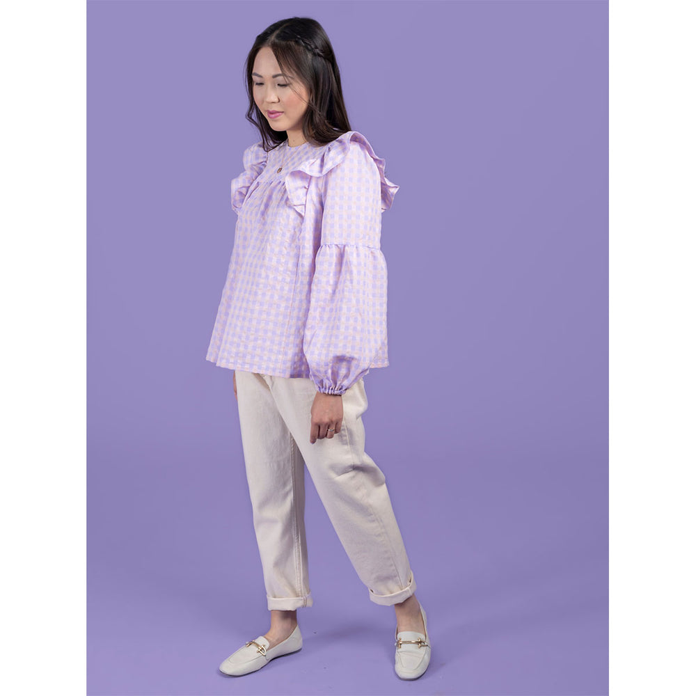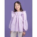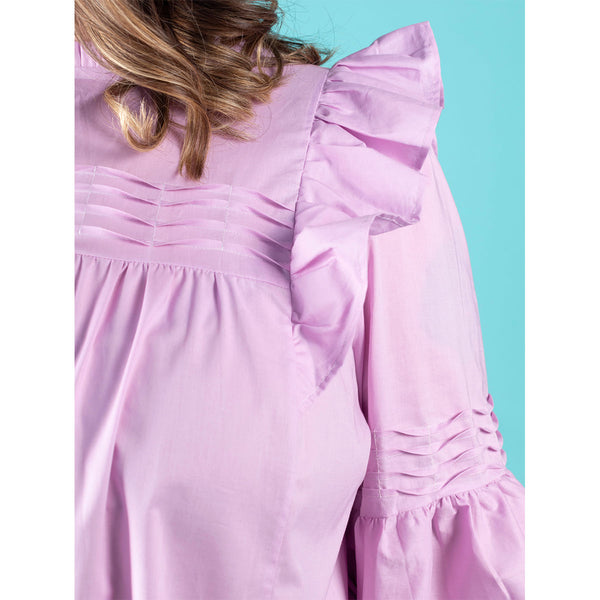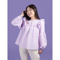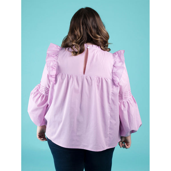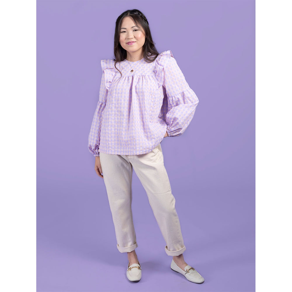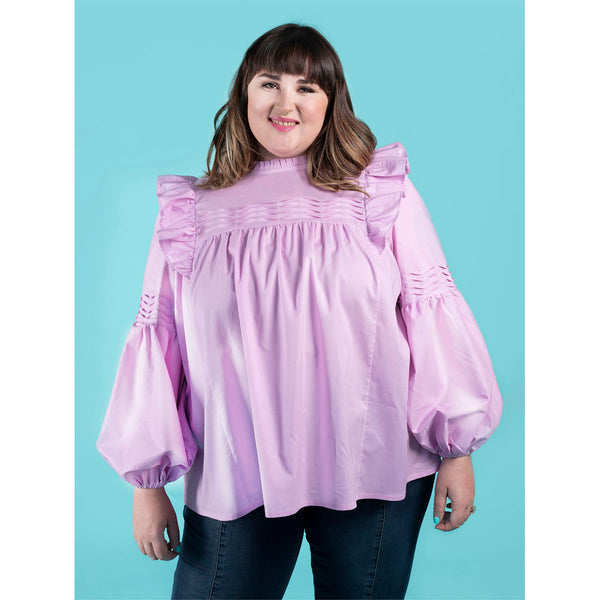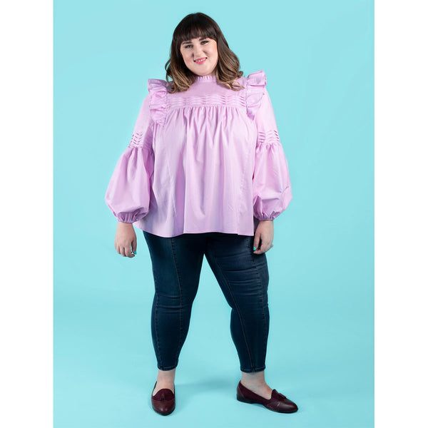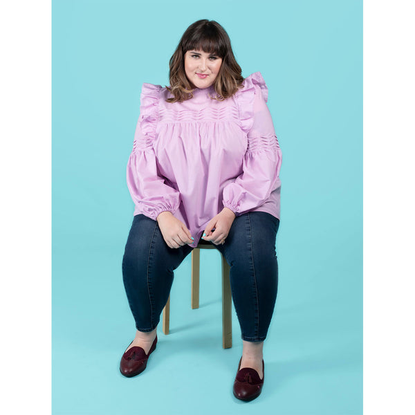 Romantic‚ floaty and super swishy‚ the Marnie blouse and mini dress will steal your heart. Keep it simple‚ or add the pretty tucks and ruffles. Breezy smock-style bodice with princess seams and gentle gathering under the yokes. Dreamy optional undulating tucks on front yoke and sleeves. Round neckline finished with bias binding‚ with optional ruffle collar. Optional shoulder ruffles for extra drama. Two-piece full-length bishop sleeves with elasticated hem. Keyhole back opening with button and loop. Choice of blouse or mini dress hem lengths.
