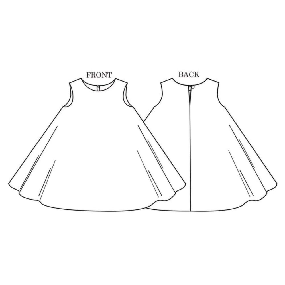 Little girl pattern for ages 3‚ 4‚ 5‚ 6‚ 7‚ and 8 years. A charmingly simple interpretation of our Trapeze dress with a huge amount of swish factor. The Trapezette is simple to make with a single button back neck opening and rouleau loop and fully faced armholes and neck for small people comfort.