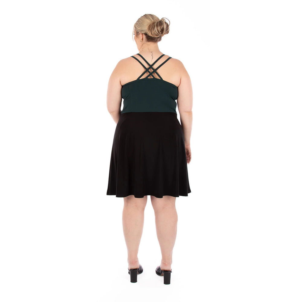 The fitted bodice‚ which can also be worn as a top (view A)‚ features a built-in shelf bra for light support and double straps that cross at the back for a secure‚ comfortable fit. The skirt (mid-thigh (B) or above-the-knee (C))— flares out with to allow for movement without too much volume.