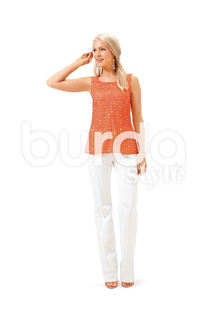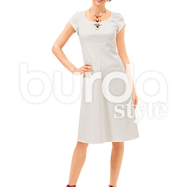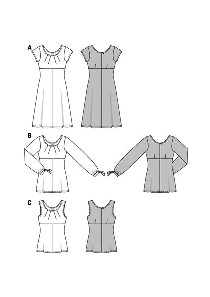 Darts fanning out from the round neckline are a lovely fashion detail on this airy summer dress with a high waist and small sleeves. The blouse and top views B and C are designed likewise. Here you can choose between long sleeves with sleeve bands or simply going sleeveless.